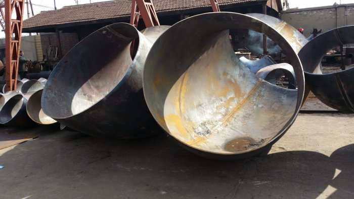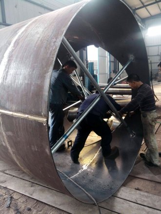 關 于大口徑薄壁 彎頭 ,我們所在進行生產的時候要打支撐,那么打支撐的目的是什么呢? 所謂的打支撐我們利用的鋼管的支撐的原理,我們首先要把鋼板進行 搞圓形,在進行搞